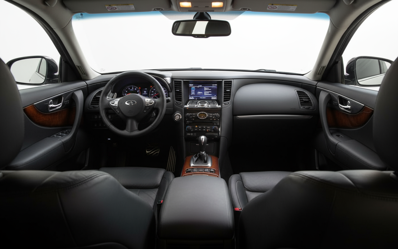 Para su época, el FX30d GT Premium era un escaparate tecnológico. Su corazón es el sistema de tracción total inteligente ATTESA E-TS, heredado del mítico Nissan GT-R, que distribuye el par de forma predictiva para garantizar el máximo agarre. La caja de cambios automática de siete velocidades es suave y eficaz, y el equipamiento de serie incluía elementos como el sistema de navegación, la cámara de visión 360º y un equipo de sonido Bose que convertía el habitáculo en una sala de conciertos. Todo estaba orientado a hacer la conducción más segura, cómoda y placentera.